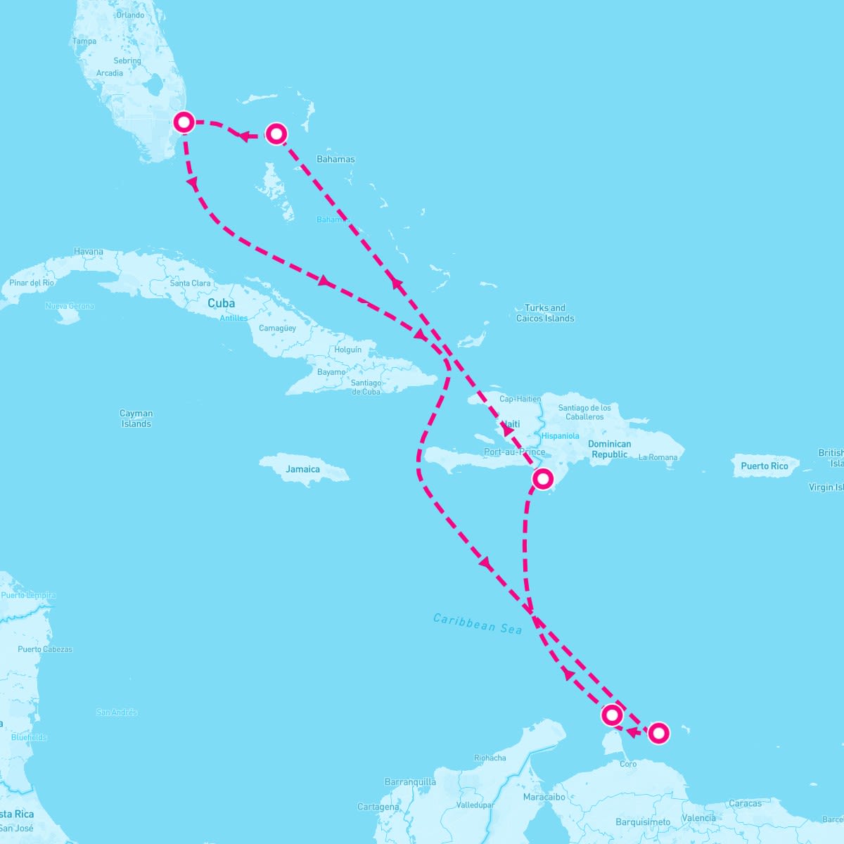 This route includes fort-lauderdale-florida, willemstad-curacao, oranjestad-aruba, cabo-rojo-dominican-republic, perfect-day-at-coco-cay-bahamas.