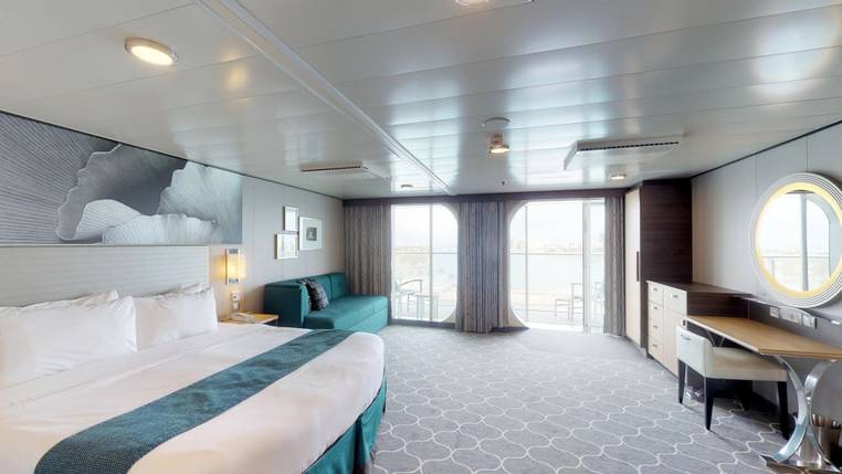 Cabin 11158 is a balcony stateroom on Deck 11 of the Oasis of the Seas, a Royal Caribbean Cruise Line ship containing a total of 2832 cabins. Located on the mid-forward, port side of the ship, this cabin accommodates up to 6 guests and offers 353 square feet of space. Classified as a Ultra Spacious Ocean View with Large Balcony category (code: 1A), the room features two royal king beds (each can convert into two twin-size beds) and two fold-down pullman beds.