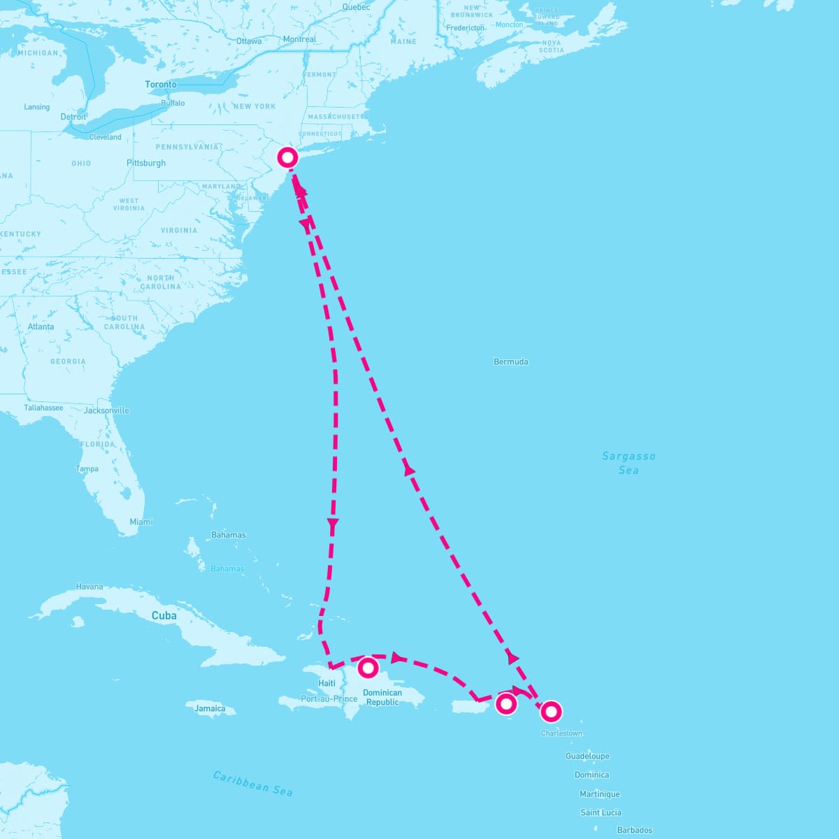 This route includes cape-liberty-bayonne-new-jersey, puerto-plata-dominican-republic, charlotte-amalie-st-thomas, philipsburg-st-maarten.