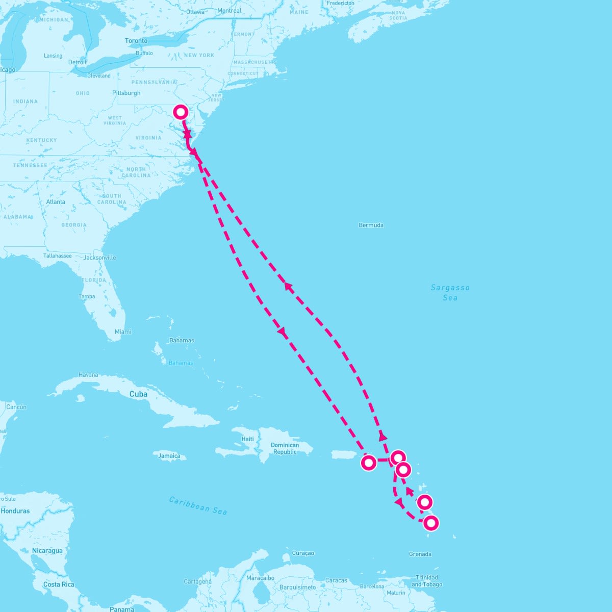 This route includes baltimore-maryland, st-croix-usvi, philipsburg-st-maarten, castries-st-lucia, roseau-dominica, basseterre-st-kitts.