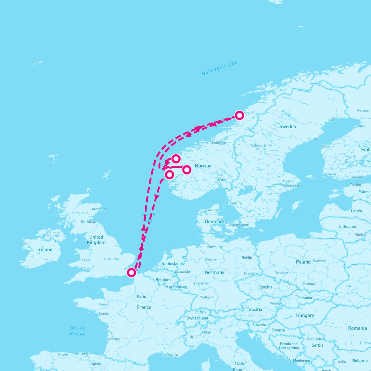 This route includes dover-london-england, sandnessjoen, flam, nordfjordeid-norway, bergen-norway.