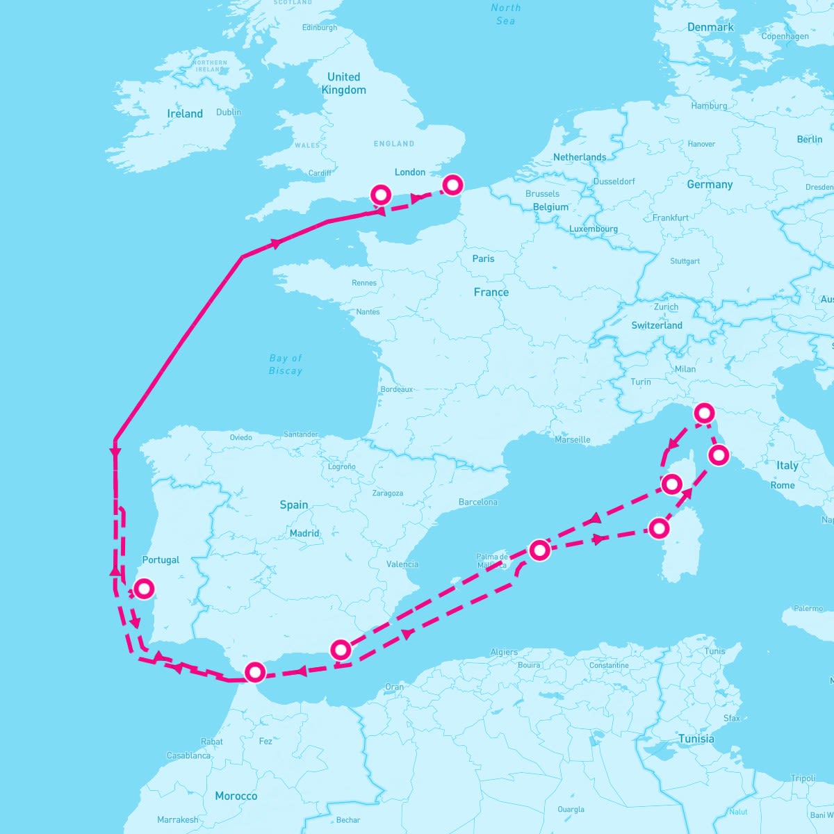 This route includes dover-london-england, lisbon-portugal, mahon-mao-menorca-balearic-islands, alghero-sardinia, portoferraio-elba, cinque-terre-italy, ajaccio-corsica, almeria-spain, gibraltar-uk, portsmouthuk.