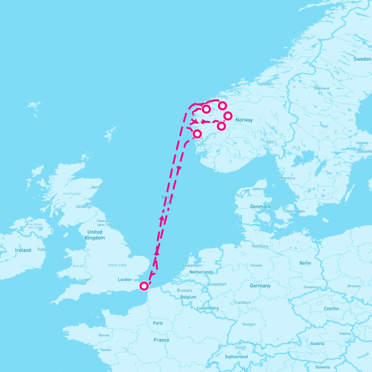 This route includes dover-london-england, cruise-geirangerfjord, nordfjordeid-norway, flam, skjolden-norway, bergen-norway.