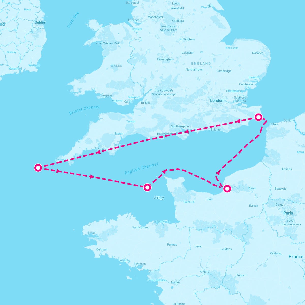 This route includes dover-london-england, isles-of-scilly, st-peter-port-guernsey-channel-islands, honfleur-france.