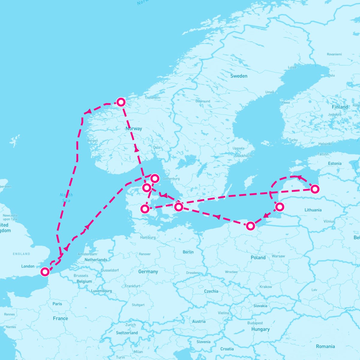 This route includes dover-london-england, skagen-denmark, fredericia-denmark, riga-latvia, klaipeda-lithuania, gdansk-poland, copenhagen-denmark, aalborg-denmark, kristiansund-norway.