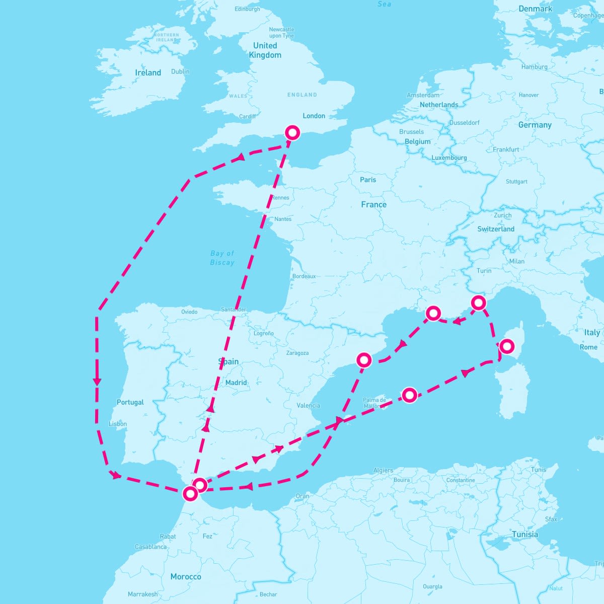 This route includes portsmouthuk, gibraltar-uk, mahon-mao-menorca-balearic-islands, ajaccio-corsica, monte-carlo-monaco, marseille-france, barcelona-spain, tangier-morocco.