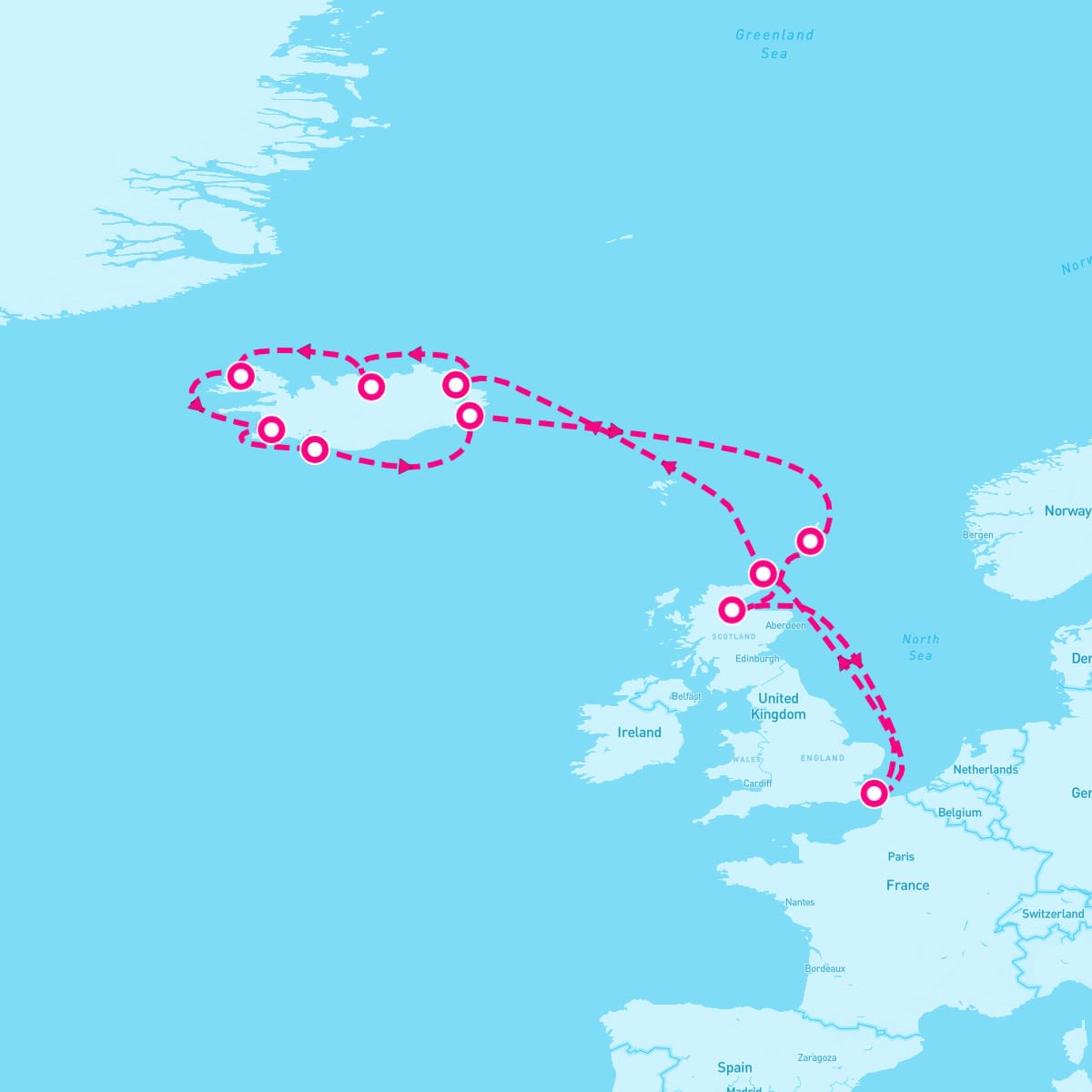 This route includes dover-london-england, kirkwall-orkney-islands-scotland, vopnafjorour-iceland, akureyri-iceland, isafjordur-iceland, reykjavik-iceland, heimaey-westman-islands-iceland, djupivogur-iceland, lerwick-shetland-islands-scotland, invergordon-inverness-scotland.