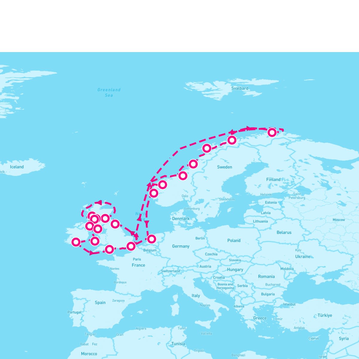 This route includes dover-london-england, trondheim-norway, bronnoysund-norway, svolvaer-lofoten-norway, tromso-norway, honningsvag-norway, cruise-nordfjord, loen-norway, bergen-norway, amsterdam-netherlands, portland-weymouth-england-uk, ringaskiddy-cork-ireland, fishguard, douglas-isle-of-man, belfast-ireland, glasgow-scotland, londonderry-northern-ireland, oban-scotland, leith-edinburgh-scotland, newcastle-england.