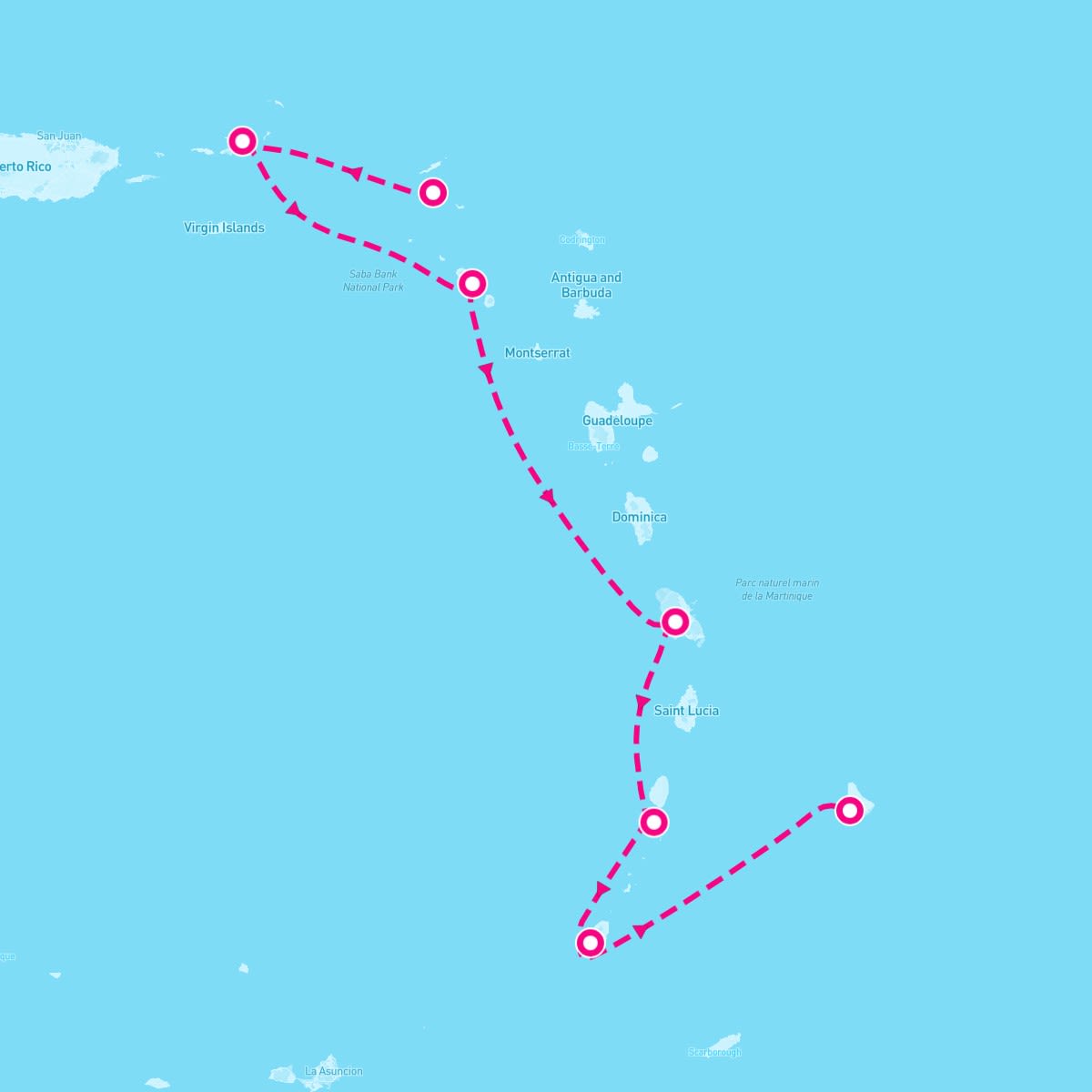 This route includes philipsburg-st-maarten, soper-s-hole-tortola-b-v-i, south-friars-bay-st-kitts, fort-de-france-martinique, port-elizabeth-bequia-grenadines, st-georges-grenada, bridgetown-barbados.