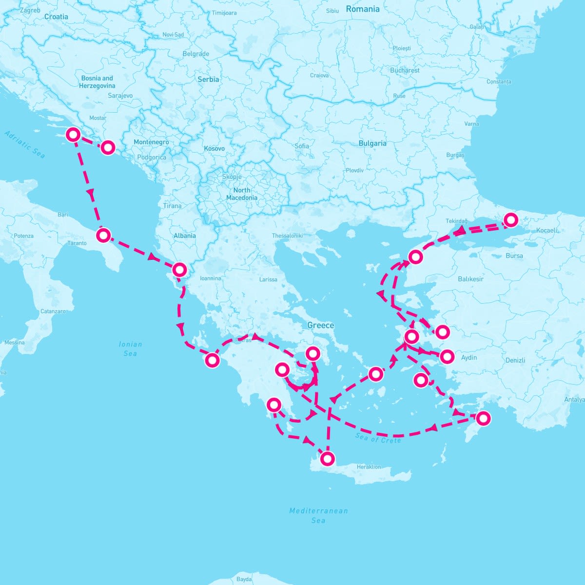 This route includes dubrovnik-croatia, korcula-island-croatia, brindisi-italy, sarande-albania, zakynthos-greece, nafplion-nauplion-greece, athens-greece, gythion-greece, chania-crete, mykonos-greece, cesme-turkey, kusadasi-turkey, istanbul-turkey, cannakale-troy-turkey, izmir-turkey, patmos-greece, rhodes-greece, spetsai.
