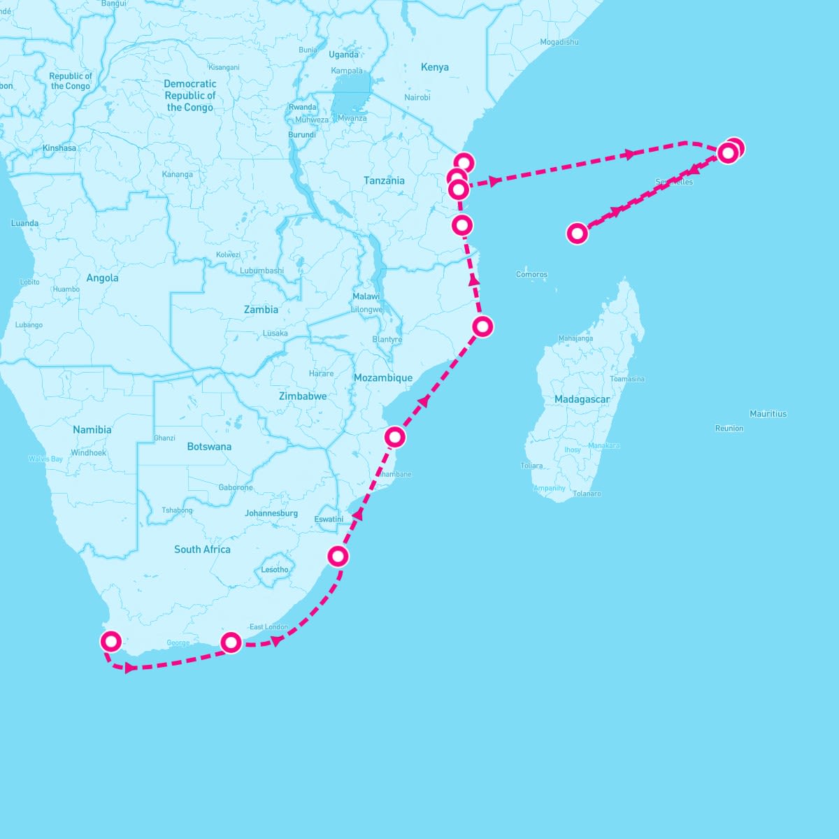 This route includes cape-town-south-africa, port-elizabeth-south-africa, richards-bay-south-africa, bazaruto-island-mozambique, ilha-de-mocambique-mozambique-island-mozambique, kilwa-kisiwani-tanzania, dar-es-salaam-tanzania, misali-island-tanzania, zanzibar-tanzania, aldabra-atoll-seychelles, assumption-seychelles, la-digue-seychelles, victoria-mahe-seychelles.