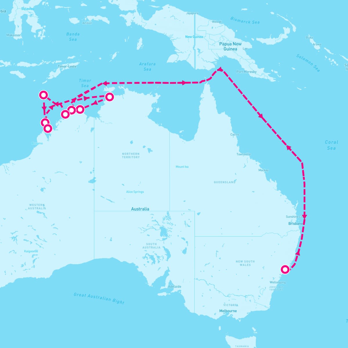 This route includes darwin-australia, king-george-river-kimberly-western-australia, swift-bay-kimberley-western-australia, ashmore-reef-australia, adele-island-australia, cruise-buccaneer-archipelago, cruise-hunter-river-mitchell-falls, cruise-vansittart-bay-australia.