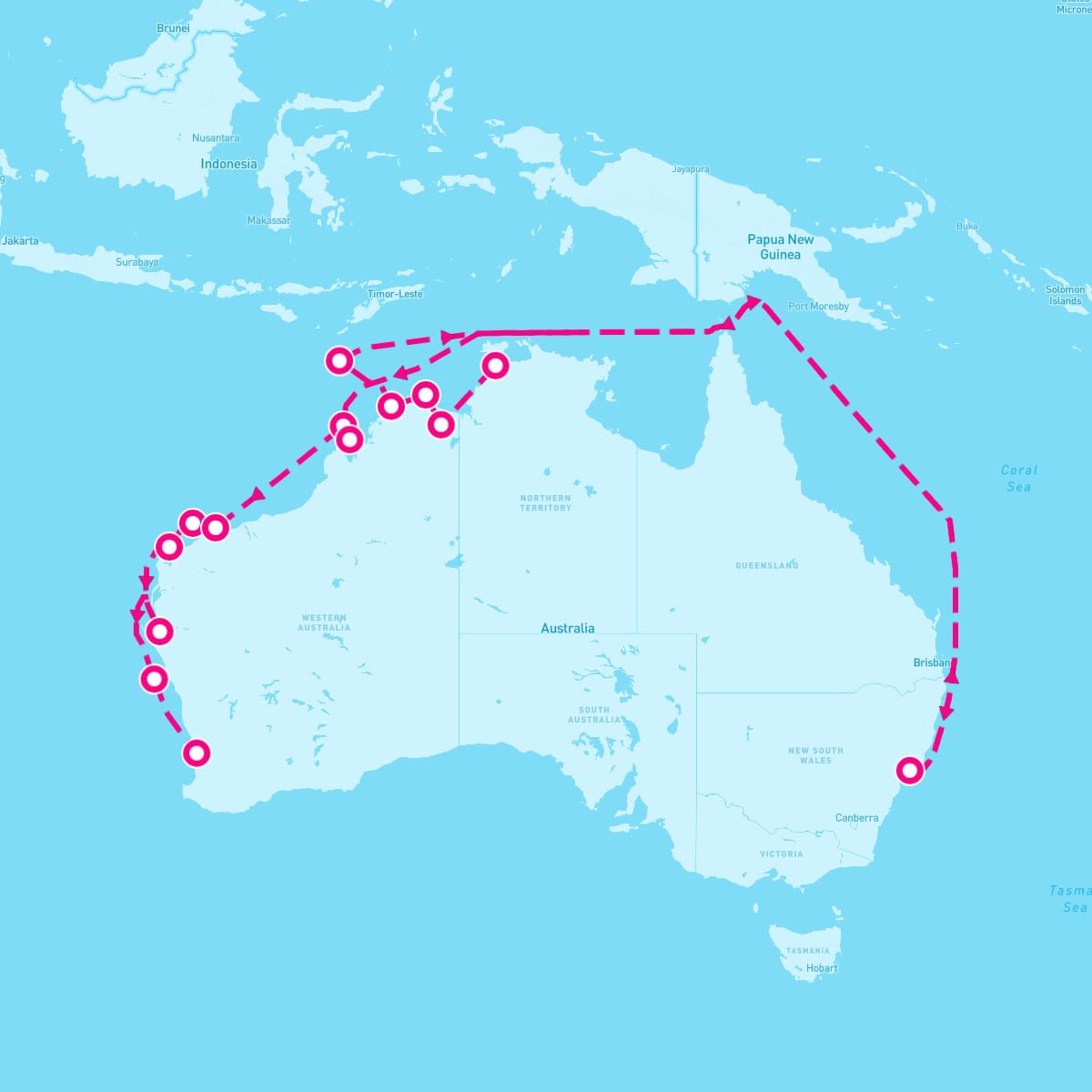 This route includes darwin-australia, wyndham-australia, king-george-river-kimberly-western-australia, swift-bay-kimberley-western-australia, ashmore-reef-australia, cruise-hunter-river-mitchell-falls, cruise-buccaneer-archipelago, adele-island-australia, cruise-dampier-archipelago-australia, cruise-montebello-islands-australia, cruise-explore-north-muiron-island-australia, cape-peron-shark-bay-australia, abrolhos-islands-australia, perth-australia.