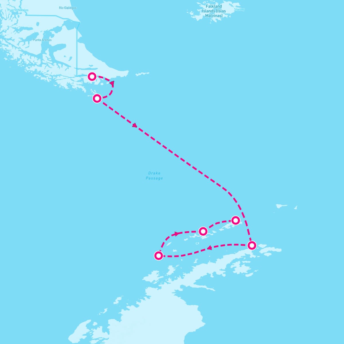 This route includes puerto-williams-chile, cruise-cape-horn-drake-passage, cruise-the-antarctic-sound, cruise-antarctic-peninsula, south-shetland-islands, king-george-island-south-shetland-islands-antarctica.