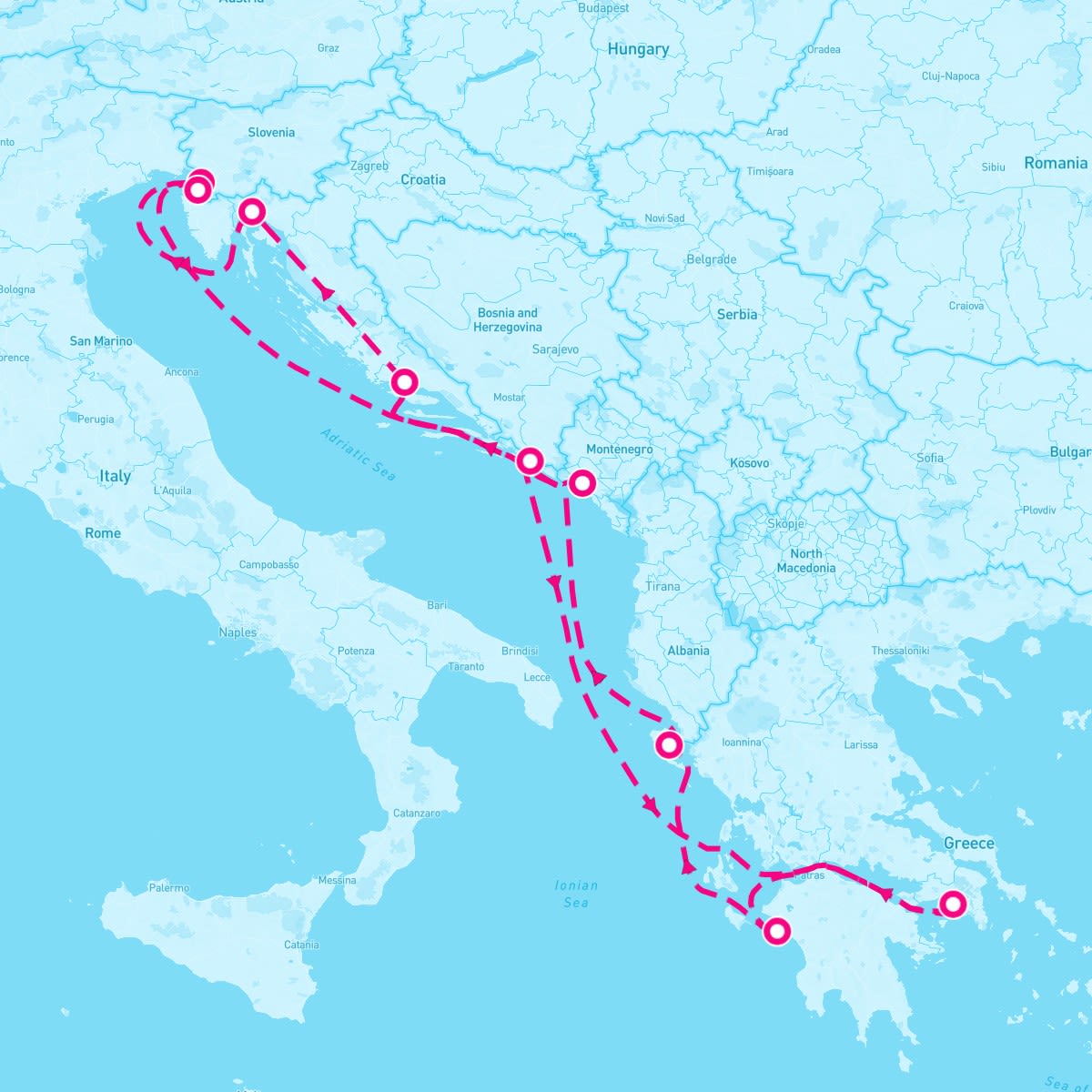 This route includes dubrovnik-croatia, athens-greece, olympia-greece, corfu-greece, kotor-montenegro, trieste-italy, koper-slovenia, rijeka, split-croatia.