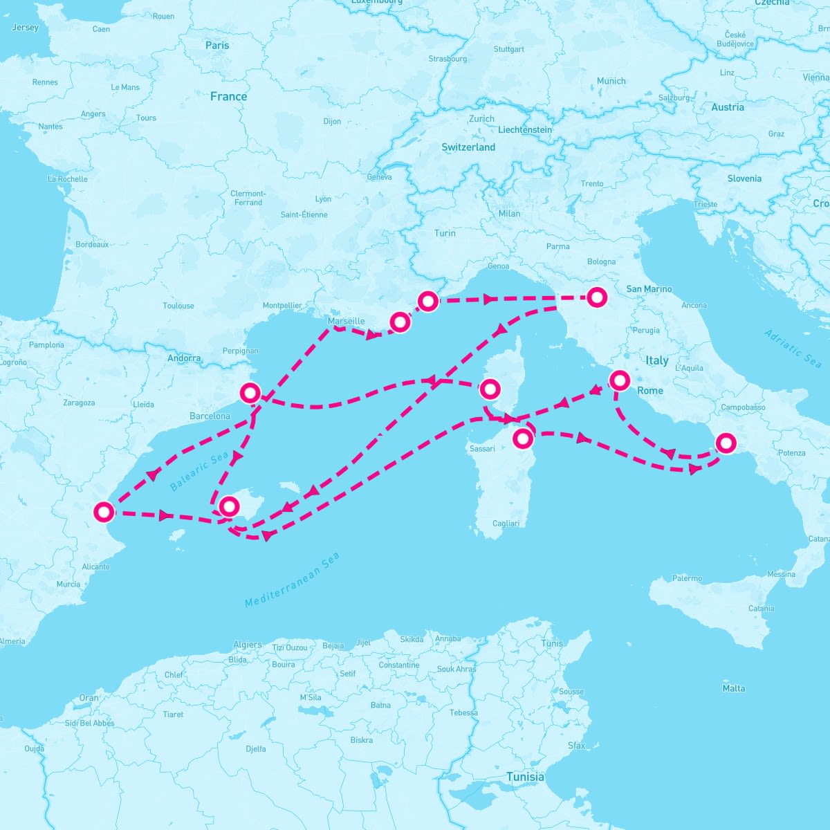 This route includes palma-de-mallorca-spain, olbiasardinia, naples-italy, rome-italy, ajaccio-corsica, palamos-spain, tuscany-region-italy, nice-france, cote-d-azur-france, valencia-spain.