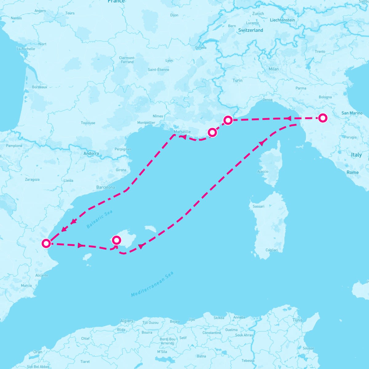 This route includes palma-de-mallorca-spain, tuscany-region-italy, nice-france, cote-d-azur-france, valencia-spain.