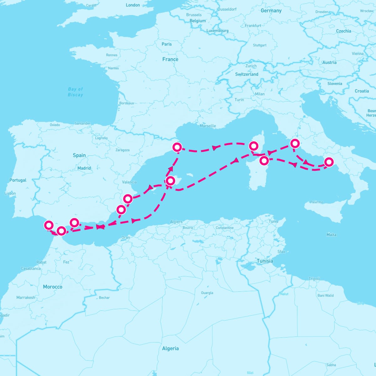 This route includes palma-de-mallorca-spain, palamos-spain, ajaccio-corsica, rome-italy, naples-italy, olbiasardinia, gibraltar-uk, cadiz-spain, malaga-spain, cartagena-spain, alicante-spain.