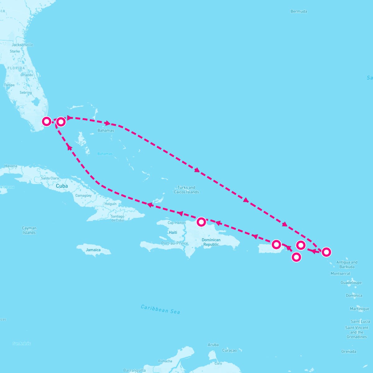 The January 11, 2027 cruise on the Brilliant Lady departs from Miami, Florida. On this 10 Night St. Maarten Tortola San Juan & More (Miami Roundtrip) sailing, the ship will visit a total of 7 cruise port destinations, including its departure port. The Brilliant Lady sets sail on Monday, Jan 11th and returns on Thursday, Jan 21st.