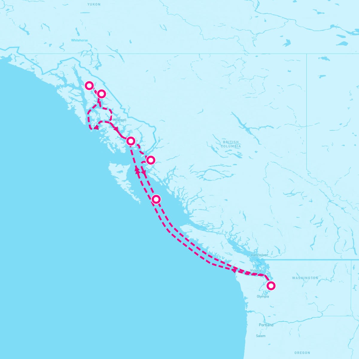 This route includes seattle-washington, cruise-inside-passage-alaska, ketchikan-alaska, juneau-alaska, cruise-tracy-arm-fjord-alaska, prince-rupert-british-columbia.