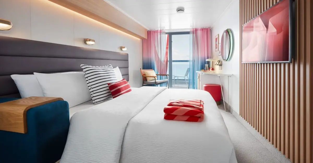 Cabin 14110A is a balcony stateroom on Deck 14 of the Resilient Lady, a Virgin Voyages ship containing a total of 1408 cabins. Located on the mid-aft, port side of the ship, this cabin accommodates up to 4 guests and offers 225 square feet of space. Classified as a Central Sea Terrace category (code: TC), the room features bunkbeds. to sleep four passeengers and two must share a bed and then a third bed is placed in l formation next to the ground-floor bed. and the fourth and in a bunk pulled down from the wall above the first..