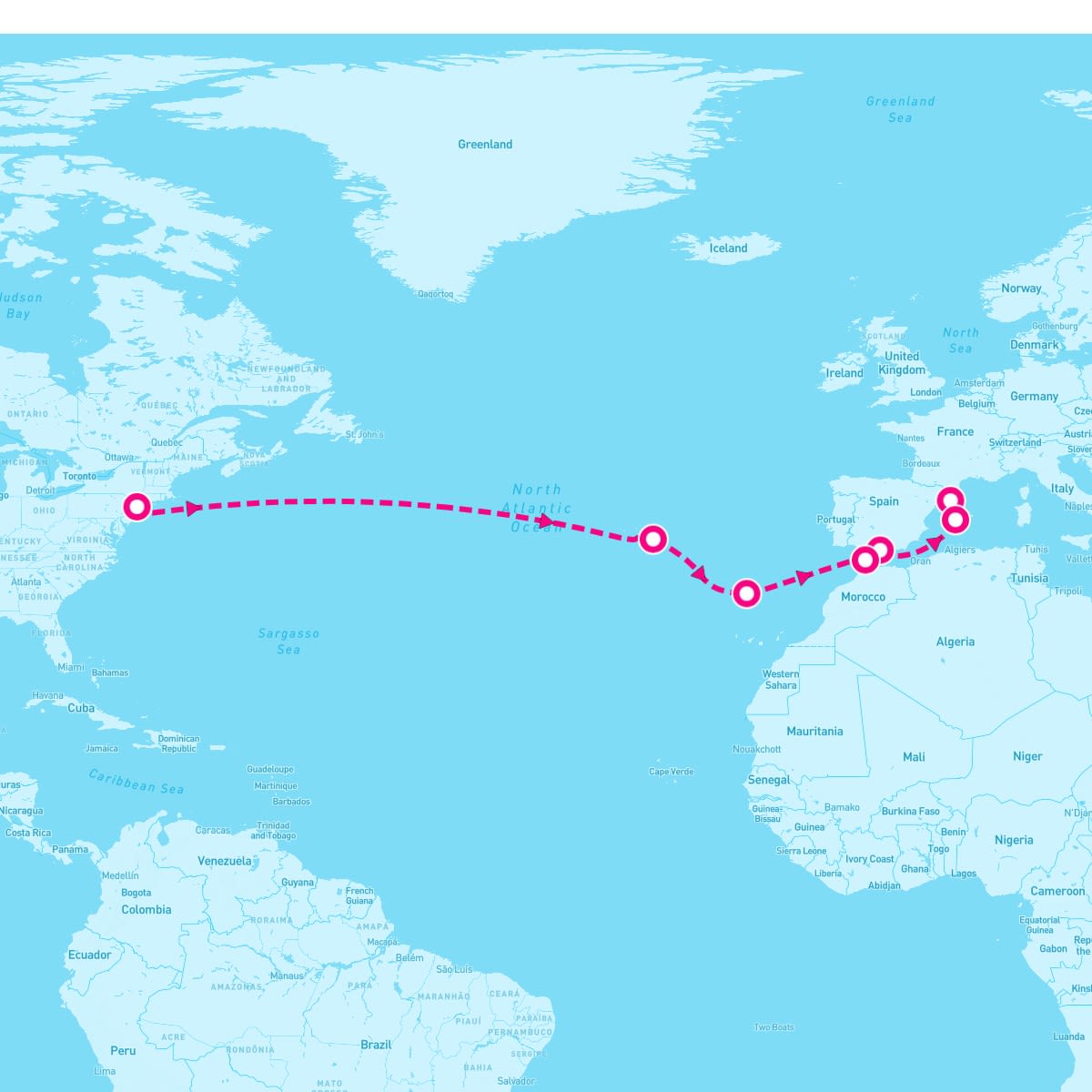 This route includes brooklyn-new-york, ponta-delgada-azores, funchal-madeira, tangier-morocco, malaga-spain, palma-de-mallorca-spain, barcelona-spain.