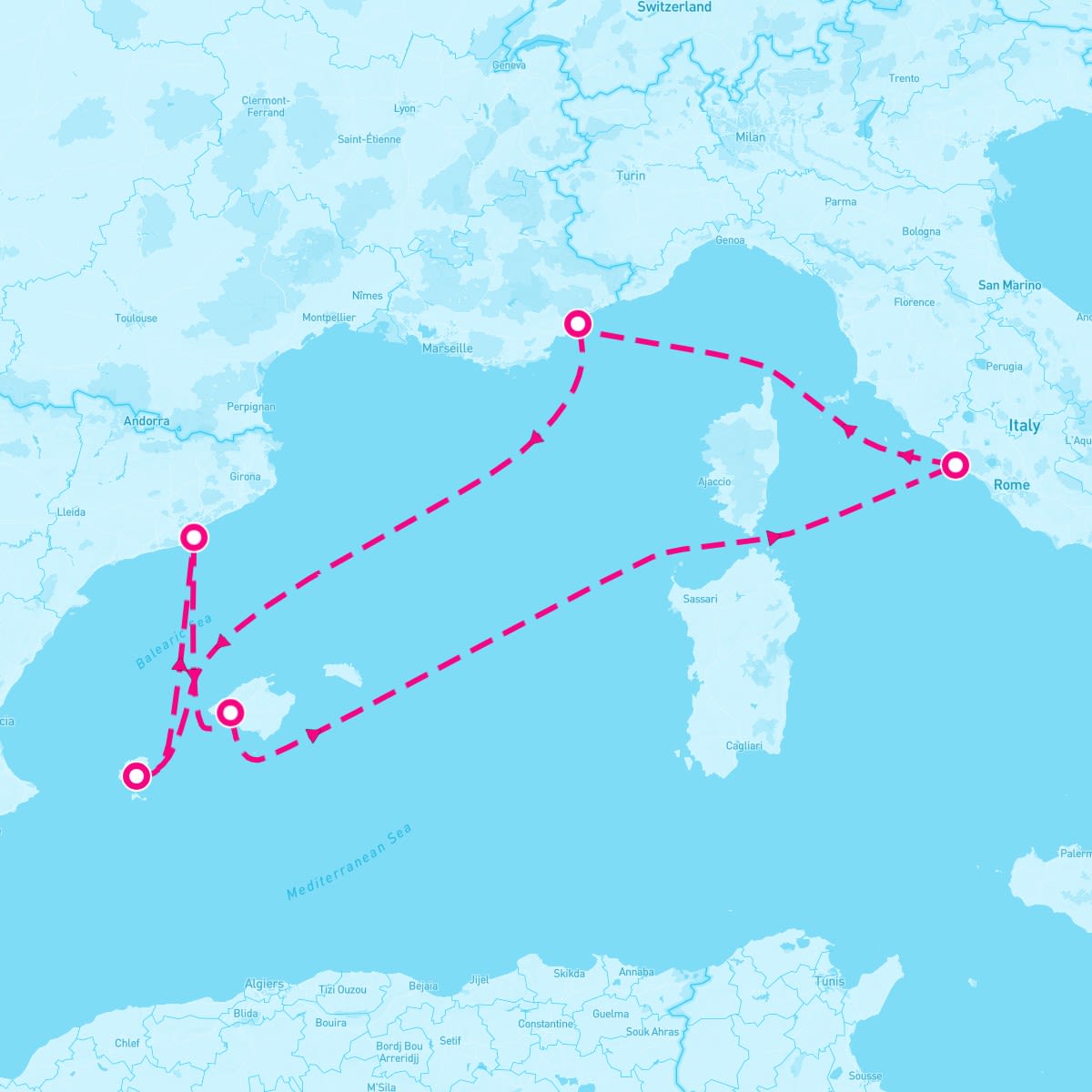 This route includes barcelona-spain, palma-de-mallorca-spain, rome-italy, cannes-france, ibiza-balearic-islands.