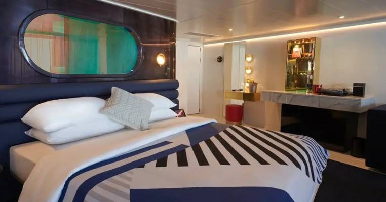 Cabin 14269A includes: European king, Terrace hammock, Large marble bathroom, Curated in-room bar on us, Outdoor champagne table, Richard's Rooftop access, Curated in-room bar on us, Early booking/Priority access, RockStar Agents, Terrace Hammock, Champagne Table, Terrace sun loungers.