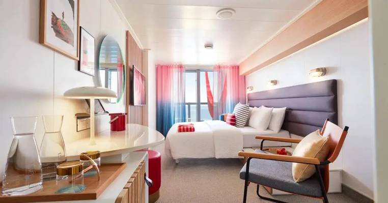 Cabin 8366A is a balcony stateroom on Deck 8 of the Valiant Lady, a Virgin Voyages ship containing a total of 1408 cabins. Located on the forward, port side of the ship, this cabin accommodates up to 4 guests and offers 225 square feet of space. Classified as a XL Sea Terrace category (code: TX), the room features bunkbeds. to sleep four passeengers and two must share a bed and then a third bed is placed in l formation next to the ground-floor bed. and the fourth and in a bunk pulled down from the wall above the first..
